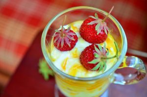 Składniki: truskawki 2 żółtka 1 szklanka mleka 1 łyżeczka mąki ziemniaczanej 6 łyżek cukru cukier waniliowy Przygotowanie: Żółtka utrzeć z